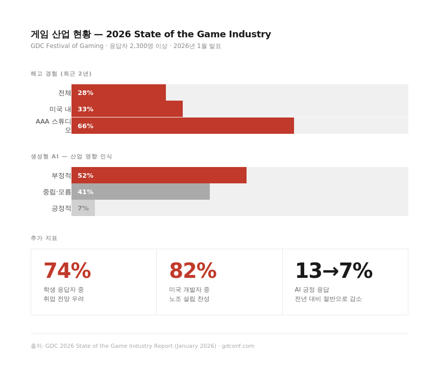 GDC가 공개한 산업 조사에 따르면 최근 2년 동안 개발자 28%가 해고를 경험했다. 현재 또는 최근 직장에서 지난 1년 동안 해고가 있었다는 응답도 절반에 가까웠다. AAA 스튜디오 종사자의 경우 3분의 2가 회사 내 해고를 경험했다고 답했다. 학생 응답자의 74%는 게임 산업 취업 전망에 대해 우려를 나타냈다.