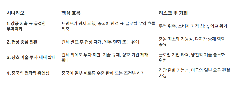 트럼프의 100 % 관세 위협은 단순한 보복을 넘어 레버리지 전략으로 해석될 수 있다. 중국이 희토류 제한을 완화하지 않을 경우, 미국은 기술 수출 통제까지 병행함으로써 중국의 산업 경쟁력을 압박할 수 있다.