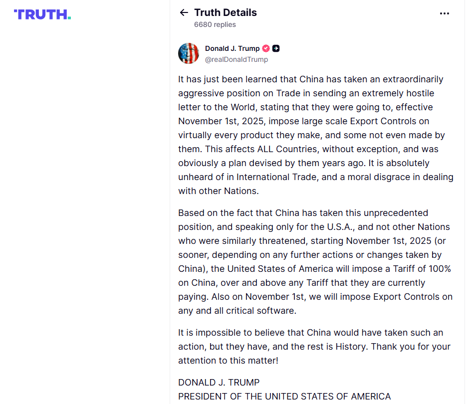 도널드 트럼프 전 미국 대통령은 트루스소셜(Truth Social)을 통해 중국산 수입품에 대해 100 % 추가 관세를 부과하겠다고 선언했다. 이 조치 외에도 그는 미국의 핵심 소프트웨어 수출에 대한 규제를 확대하겠다는 방침을 함께 발표했다. 이는 중국이 희토류(rare earth, 희소금속) 수출 제한을 강화한 데 대한 반격으로 풀이된다.