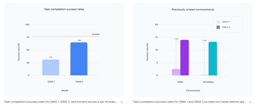 이 두 환경은 SIMA 2가 학습 과정에서 한 번도 직접 플레이해본 적 없는 ‘미지의 게임’이다. 그럼에도 SIMA 2는 “캠프파이어를 찾아라”, “자원을 캐고, 도구를 만들어라”와 같은 길고 복잡한 지시를 이해하고 수행하는 데 성공했다.