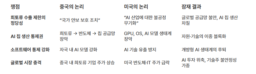 희토류는 AI 칩, 전기차 배터리, 반도체, 레이더, 태양광 등 모든 첨단산업의 ‘핵심 광물’로, 그 흐름을 통제하는 것은 곧 AI 산업 생태계의 원료 공급망을 장악하는 일이다.