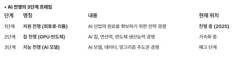 현재는 1단계의 절정에 있으며, 희토류 전쟁이 장기화될 경우 칩 공급망 붕괴 → 모델 학습 지연 → AI 생태계 불균형으로 번질 가능성이 높다.