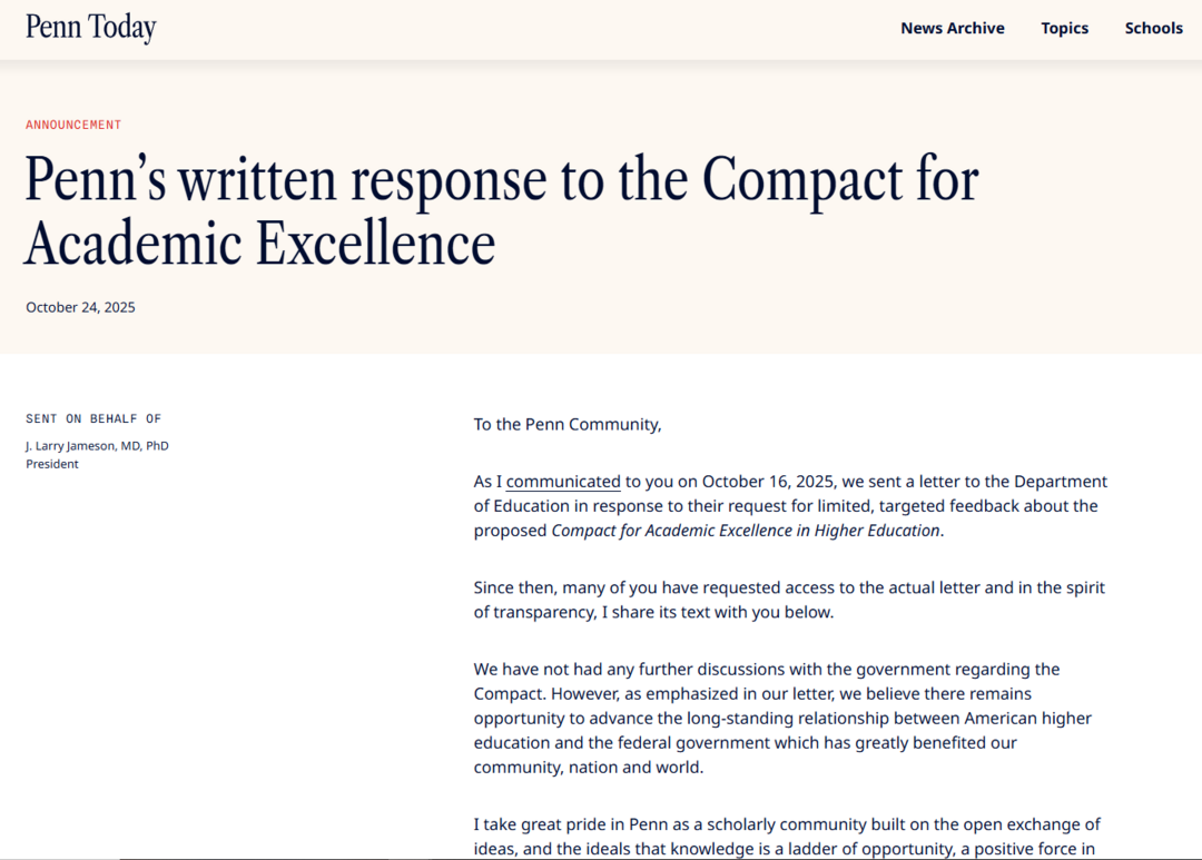 이에 대해 J. 래리 제임슨(J. Larry Jameson) 펜실베이니아대 총장은 “특정 정치적 성향의 사상만을 보호하는 일방적 조건은 민주주의와 대학의 본령에 반한다”며 서명을 단호히 거부했다. 그는 백악관에 보낸 공식 서한에서 “대학의 사명은 관점의 다양성과 자유로운 사상의 교류를 지키는 것”이라고 강조했다.