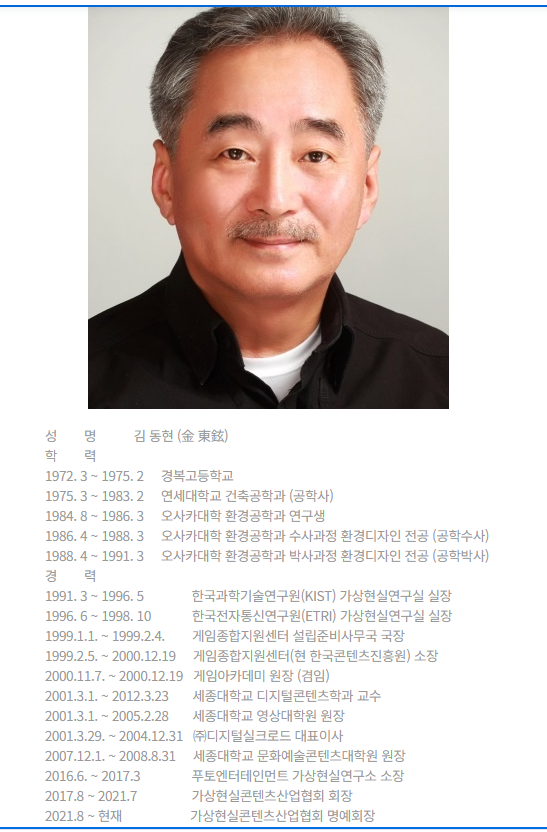 김동현 박사는 KIST와 ETRI에서 가상현실 연구를 이끌었으며, 게임종합지원센터 초대 소장과 게임아카데미 원장을 역임하며 1차 한류혁명 시기 게임 산업 육성에 중요한 역할을 했다. 이후 세종대학교에서 문화기술·디지털콘텐츠 분야 교육과 연구를 계속하며 산업 인력 양성에 힘썼다.