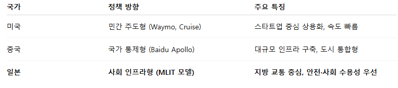 즉, 일본형 자율주행 모델은 “단일 기업 중심이 아닌, 산업 연합체 중심의 사회 인프라형 모델”이다.