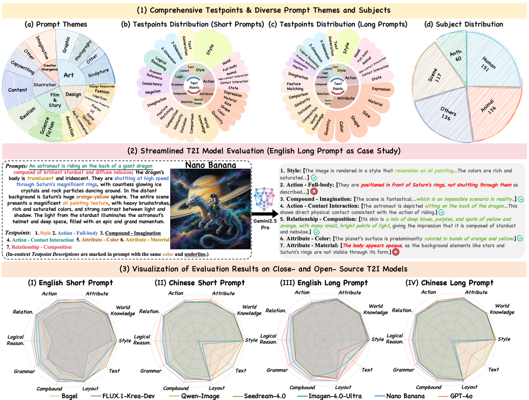 이 논문은 텍스트-이미지(T2I) 생성 모델이 프롬프트의 의미를 얼마나 정확하게 반영하는지 평가하는 통합 벤치마크 UniGenBench++를 제안한다. 기존 벤치마크가 프롬프트 다양성, 다국어 지원, 세분화된 평가 기준이 부족했던 한계를 극복하기 위해, 5개 메인 테마와 20개 하위 테마로 구성된 600개의 계층적 프롬프트를 제공한다. 또한, 10개의 기본 기준과 27개의 하위 기준으로 의미 일관성을 세밀하게 평가하며, 영어/중국어 및 단문/장문 버전을 모두 포함하여 모델의 견고성을 테스트한다.