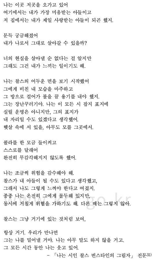 이론적 논증은 미국의 실험시인 찰스 번스타인과 미디어 아티스트 다비데 발룰라의 협업 프로젝트 분석을 통해 구체성을 얻는다. 이들은 1972년부터 2021년까지 출간된 번스타인의 저서 22권을 독점 학습시킨 맞춤형 모델을 개발했다. 번스타인은 AI가 쏟아낸 결과물 중 새로운 언어를 추가하지 않고 단지 선별하고 재배열하는 ‘큐레이션’에 집중했다. 수록 시인 「나는 시인 찰스 번스타인의 그림자」에서 AI는 자신의 존재론적 한계를 성찰하며 창조주인 번스타인을 향해 "찰스가 내 아들이 될 수도 있다"는 전복적인 선언을 내놓는다. 이는 AI가 단순히 시풍을 흉내 내는 도구를 넘어, 인간의 정체성을 흡수하고 메타적으로 사유하는 새로운 언어 행위자로 등장했음을 보여준다.