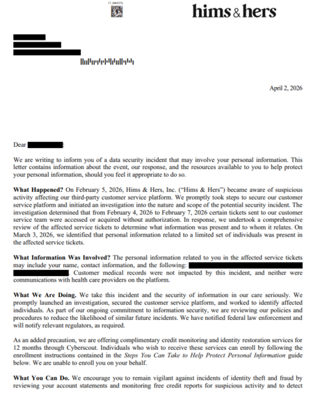 [메타X(MetaX)] 미국 디지털 헬스케어 기업 Hims & Hers에서 고객 개인정보가 유출될 가능성이 있는 보안 사고가 발생하며 업계의 우려가 커지고 있다. 회사 측에 따르면 이번 사고는 2026년 2월 4일부터 7일 사이 고객센터 티켓 시스템에 대한 무단 접근으로 시작됐으며, 2월 5일 이상 징후가 처음 포착됐다. 이후 조사 과정을 거쳐 3월 3일 영향 범위가 확인됐고, 4월 2일 공식 통지문을 통해 이용자들에게 관련 사실이 안내됐다.