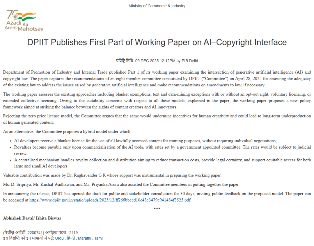 인도 정부가 생성형 인공지능(AI)과 저작권의 충돌 지점에 대해 독자적인 정책 해법을 제시하며, 글로벌 AI 규범 논의의 중심으로 부상하고 있다. 인도 상공부 산하 산업·내부무역진흥국(DPIIT)은 2025년 12월 9일, 생성형 AI와 저작권 법제의 관계를 다룬 작업보고서(Working Paper) 1부를 공식 공개하고, 향후 제도 개편 가능성을 포함한 정책 논의를 본격화했다.