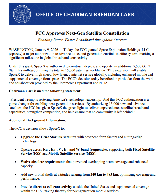FCC는 이번 결정으로 스페이스X가 추가로 7,500기의 2세대 스타링크 위성을 구축·발사·운영할 수 있도록 허가했으며, 이에 따라 스타링크 전체 위성 수는 총 1만5,000기로 확대된다.