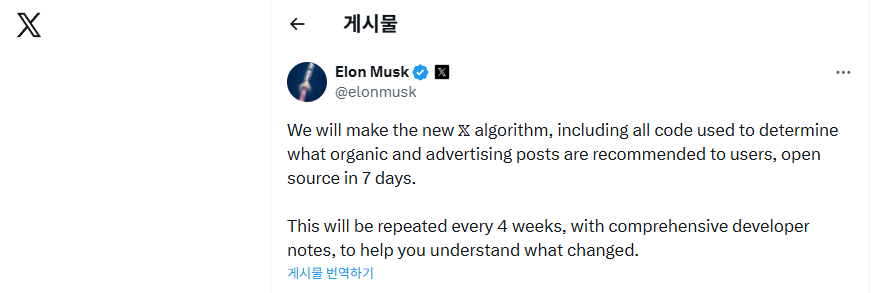 Elon Musk가 운영하는 소셜미디어 X가 추천 알고리즘을 전면 오픈소스로 공개하겠다고 밝혔다. 머스크는 2026년 1월 11일(현지시간) X를 통해 “유기적 게시물과 광고 게시물이 사용자에게 노출되는 방식을 결정하는 모든 코드를 7일 내 공개하겠다”고 발표했다. 아울러 이후 4주마다 코드 업데이트와 함께 변경 사항을 설명하는 개발자 노트를 지속적으로 공개하겠다고 덧붙였다.
