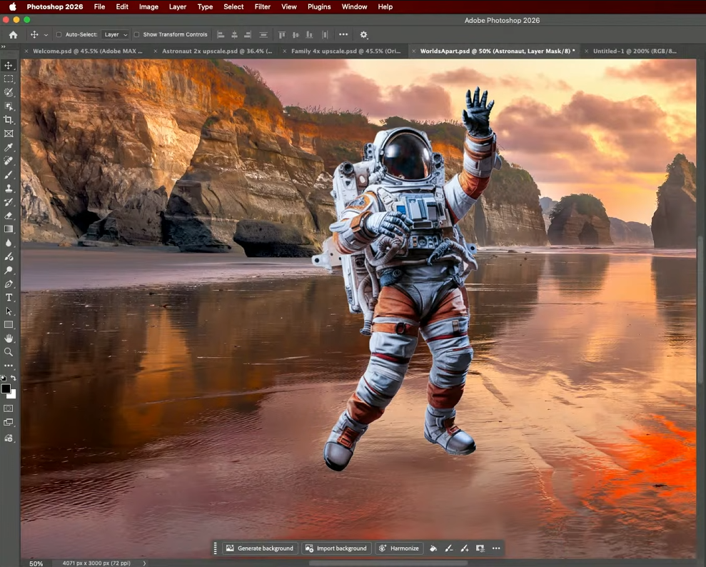 서로 다른 이미지에서 가져온 사진들은 조명상태가 달라 어색하게 보인다. 이것을 자연스럽게 만들어주는 일이 디자이너들이 많은 시간을 들여 하는 일이었는데, 하모나이즈는 조명상태 뿐만 아니라 주변 반사체나 그림자까지 만들어 줄 수 있다. 이는 수동으로 컬러 밸런스나 커브를 조정해야 했던 복잡한 작업을 인공지능이 대신해주는 기능이다.