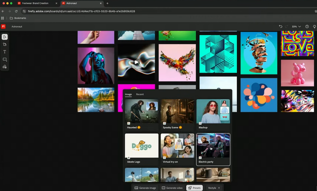 Firefly boards는 이미지 생성도구를 넘어, 아이디어를 발상하고 공유하며 함께 발전시킬 수 있는 무한 협업캔버스다. 파이어플라이 보드는 이미지, 텍스트, 영상, 디자인 요소를 자유롭게 배치해 무드보드를 구성할 수 있다. Remix 기능은 서로 다른 이미지들의 특징을 자동 분석, 결합해 새 콘셉트를 생성한다. Eyedropper tool을 통해서 색상 뿐만 아니라 스타일, 구도, 조명 등 시각 속성을 추출해 이미지 생성에 활용할 수 있다. 뿐만 아니라 다양한 프리셋이 존재하여 특정한 효과와 퀄리티를 손쉽게 만들어 낼 수 있다.